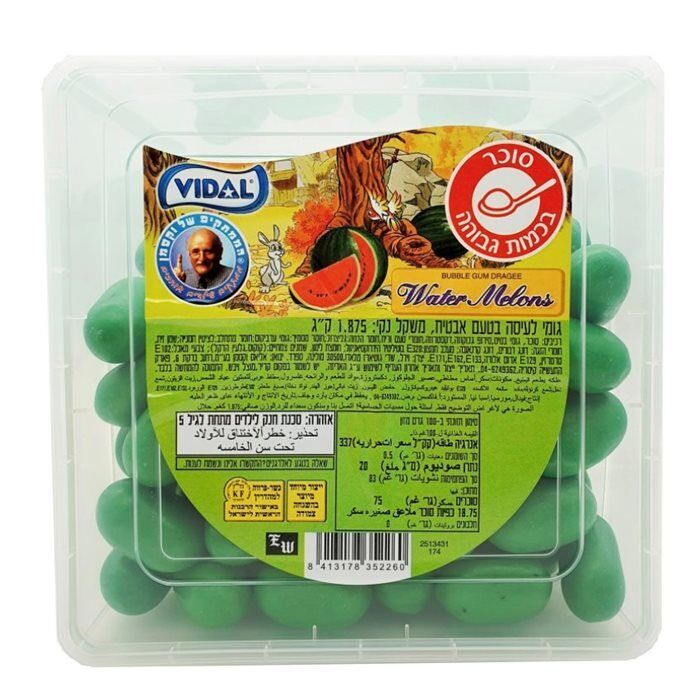 מסטיק בטעם אבטיח גדול מכיל 1.875 ק"ג. כ-170 יחידות אבטיח לערך. כ-45 אג' ליחידה.