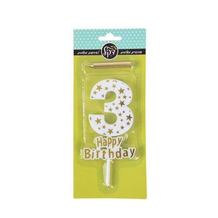 נר יום הולדת מספר 3- זהב בסיס פלסטיק גובה 13.50 ס"מ