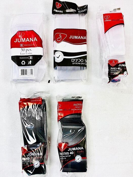 סכינים \ מזלגות\ כפות יוקרתיים בצבע שקוף \ שחור. 1000 יחידות בקרטון. בחבילה 40 או 50 יחידות עלות חבילה של 40 יחידות כ-2.98 ש"ח עלות חבילה של 50 יחידות כ- 3.725 ש"ח.