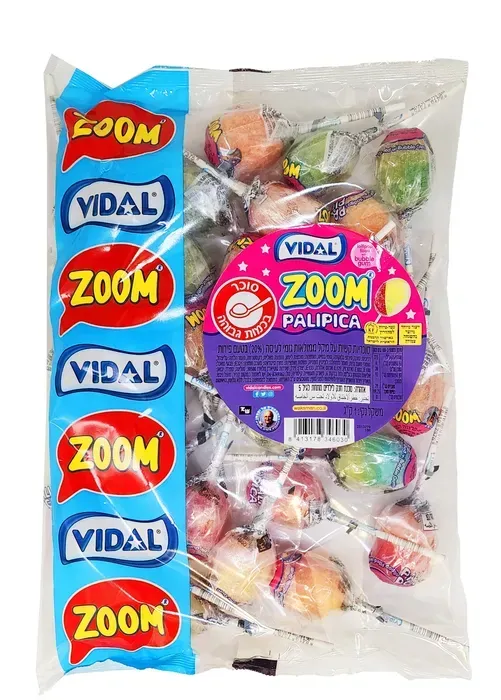 סוכריה זום על מקל צבעונית חמוצה ממולאת בגומי לעיסה. כ-30 יחידות בשקית. כ-1.6 ש"ח ליחידה.