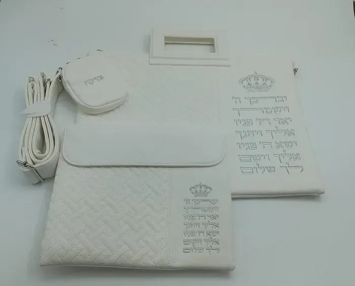 סט תיק מהודר לנשיאת טלית ותפילין כולל ידיות ורצועה. בצבע לבן עם כיתוב ברכת כוהנים בצבע כסף.
