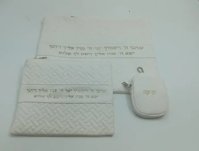 סט תיק מהודר לתפילין וטלית בצבע לבן בכיתוב ברכת כוהנים בצבע זהב