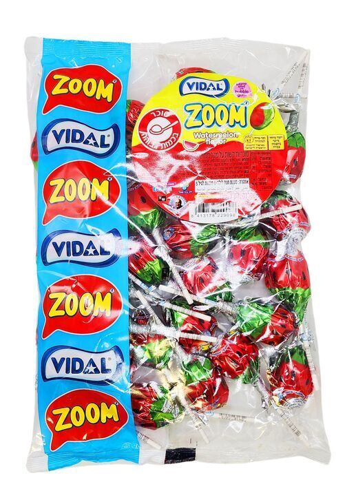 סוכריה זום על מקל בטעם אטיח ממולאת בגומי לעיסה. כ-30 יחידות בשקית. כ-1.6 ש"ח ליחידה.