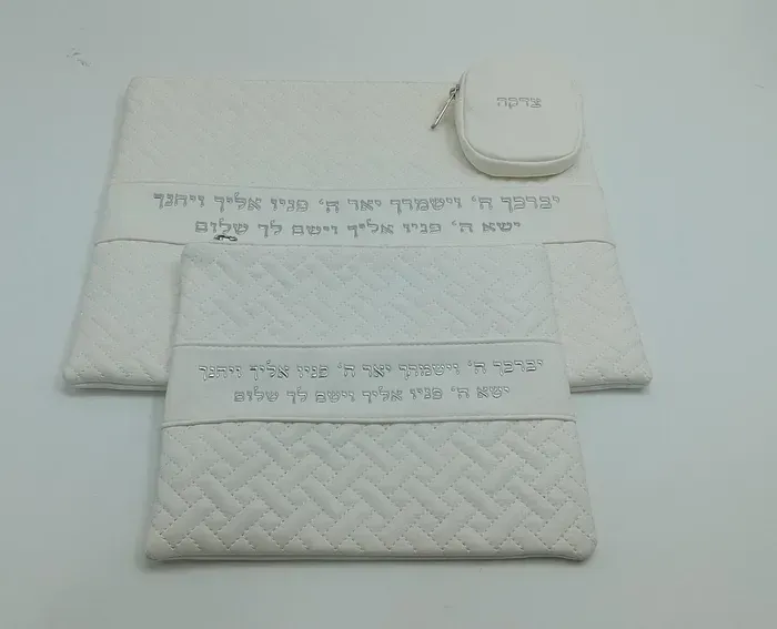 סט תיק מהודר לתפילין וטלית בצבע לבן בכיתוב ברכת כוהנים בצבע כסף