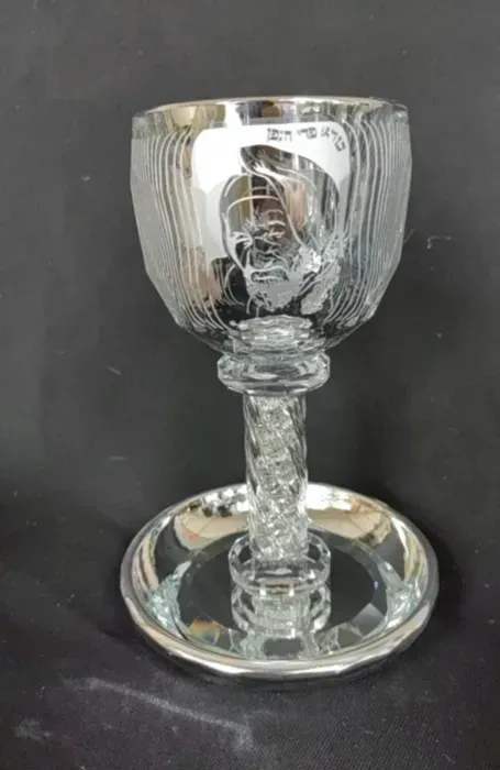 גביע קריסטל מהודר לקידוש בצבע כסף חריטה של באבא סאלי הצדיק זכותו תגן עלינו. גובה 19 ס"מ