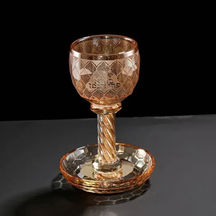 גביע קריסטל מהודר לקידוש בצבע זהב בחריטה של בורא פרי הגפן. גובה 19 ס"מ